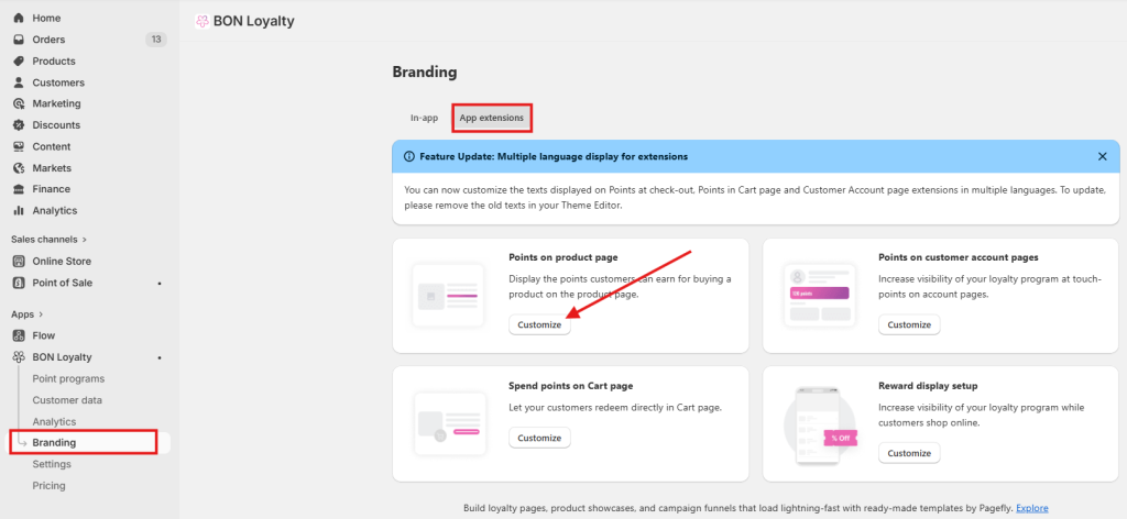 1. Go to BON > Branding > App extensions > Points on Product page