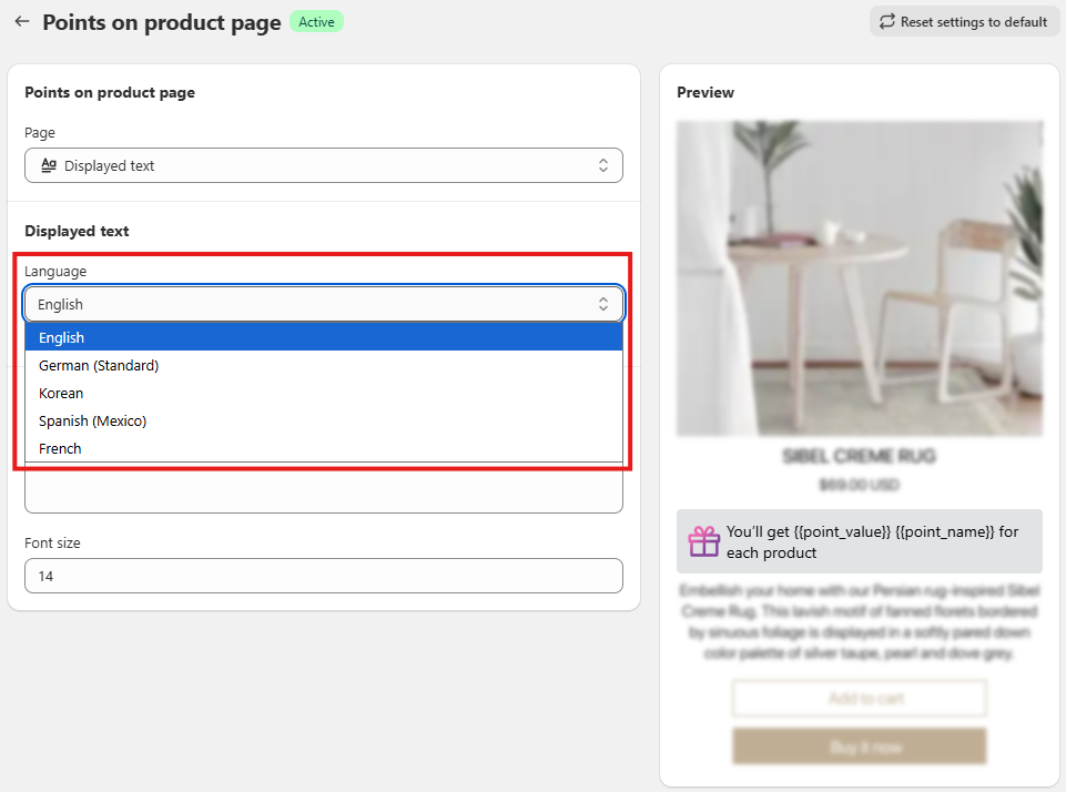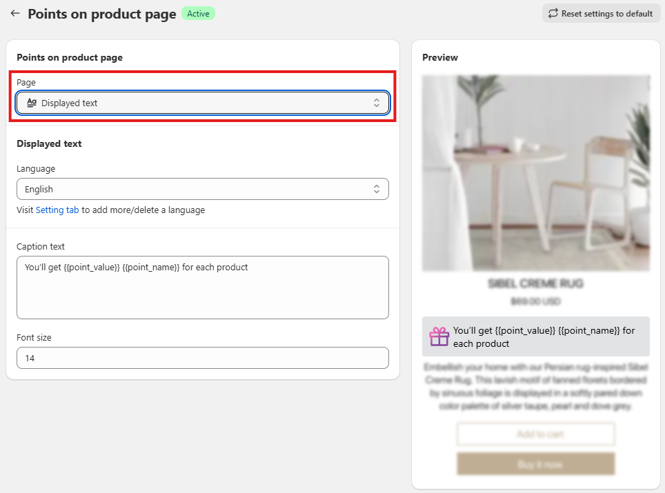- Within the Points on Product page settings > Go to the Displayed Text tab > Customize the Text to match your store’s tone and messaging.