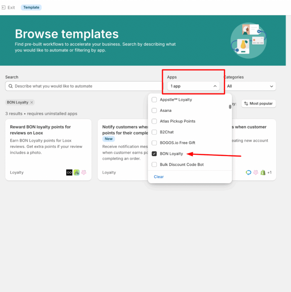 Select the template ‘Notify customers when they earn points for their completed orders’.