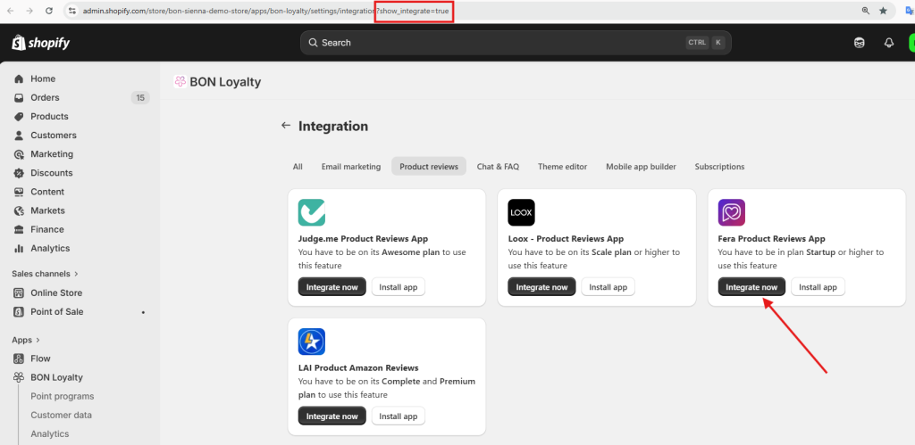 Please note that in order to integrate BON with Fera, make sure that Fera has been installed in your store.
