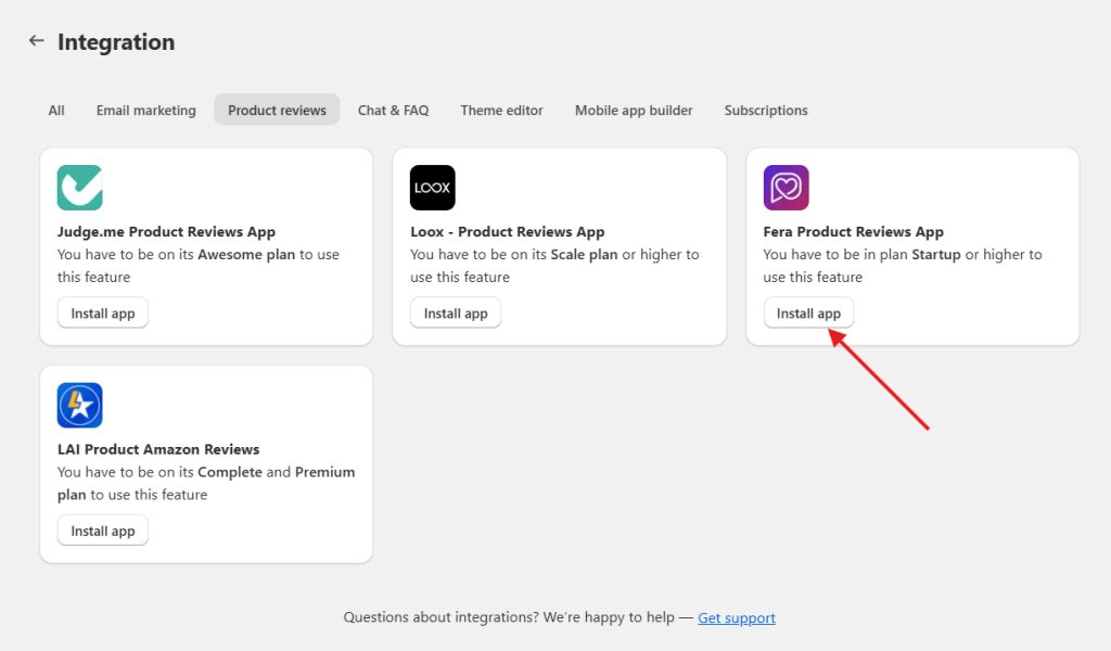 - Once you’ve got the access to tab Integrate, you will be asked to install Fera. Kindly click ‘Install app’ to be navigated to Fera’s app listing.