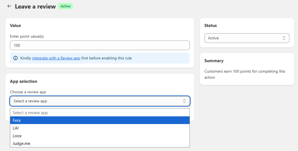 In the setting screen, you can enter the points value for each review. Then, select Fera as your Review app.
