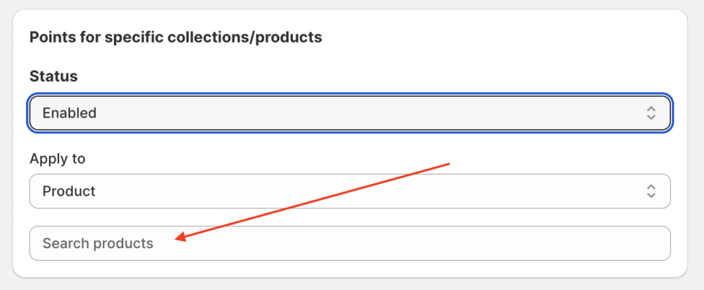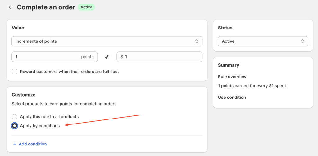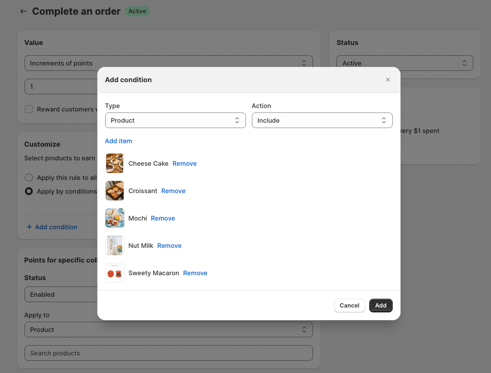 Set points for specific collection or product is an add-on condition applied to your Complete an order earning rule. It provides a point benefit for selected products or collections, giving customers an extra incentive to purchase those items.