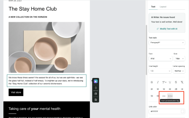 - Then, click on the content section > On the right-hand side menu, select Insert personalization tag.