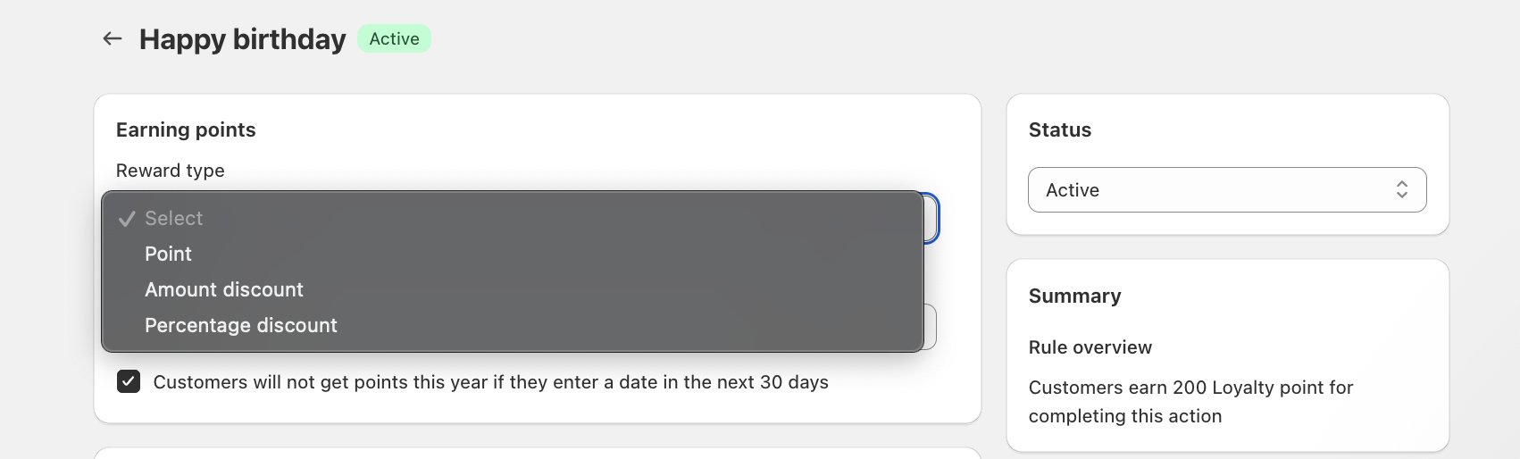 You can choose to reward customers with points, or discount rewards by choosing from the drop-down selection for Reward type.