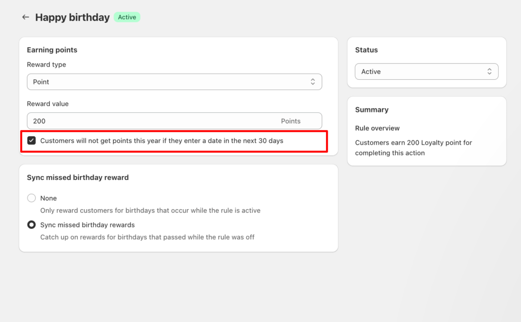 Recognizing your customers on their special day is a wonderful way to strengthen your relationship with them through your loyalty program. To enable this feature, head over to Point programs > ポイント獲得 > 誕生日特典.