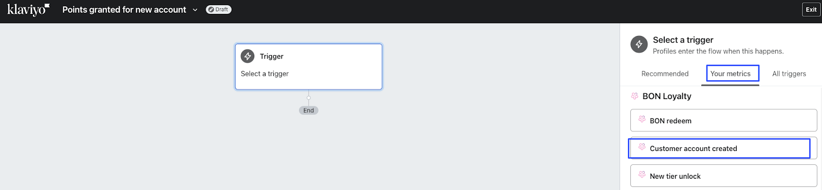 3.The flow builder will ask you to select a trigger. Click Your metrics > BON Loyalty. Search for the preferred BON event on the list. In this example, we will add ‘Customer account created’.