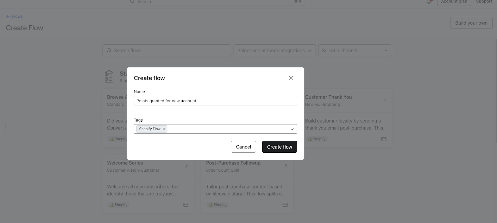 2. Enter the name of your new flow in the pop-up. Optionally, add the tags to organize your flows and click Create flow.