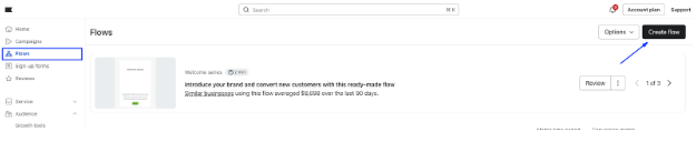 1. Klaviyoアカウントで「Flows」に移動し、「Create flow > Build your own」をクリックします。