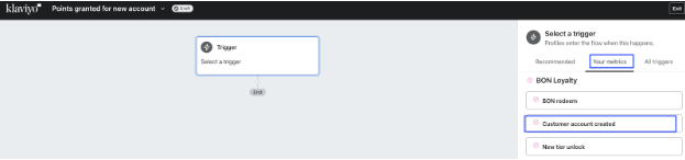 フロービルダーでトリガーの選択が求められます。「Your metrics > BON Loyalty」をクリックし、一覧から使用したいBONのイベントを検索します。この例では「Customer account created」を選択します。