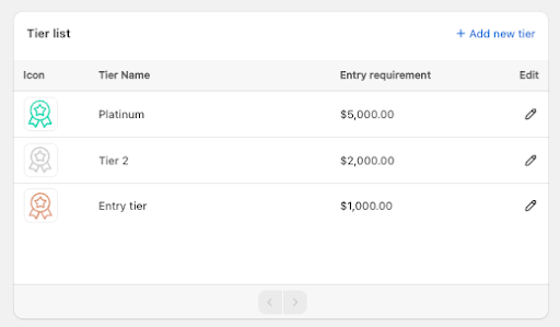 Partners are categorized into a tier based on their lifetime total spending. Store owners define the spending threshold required to reach each tier.
